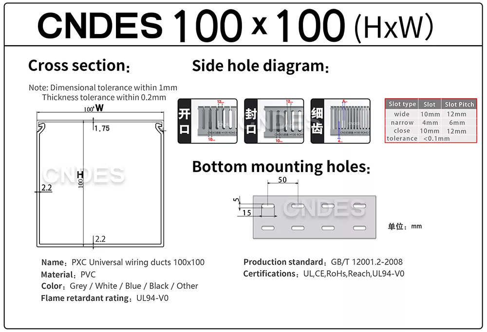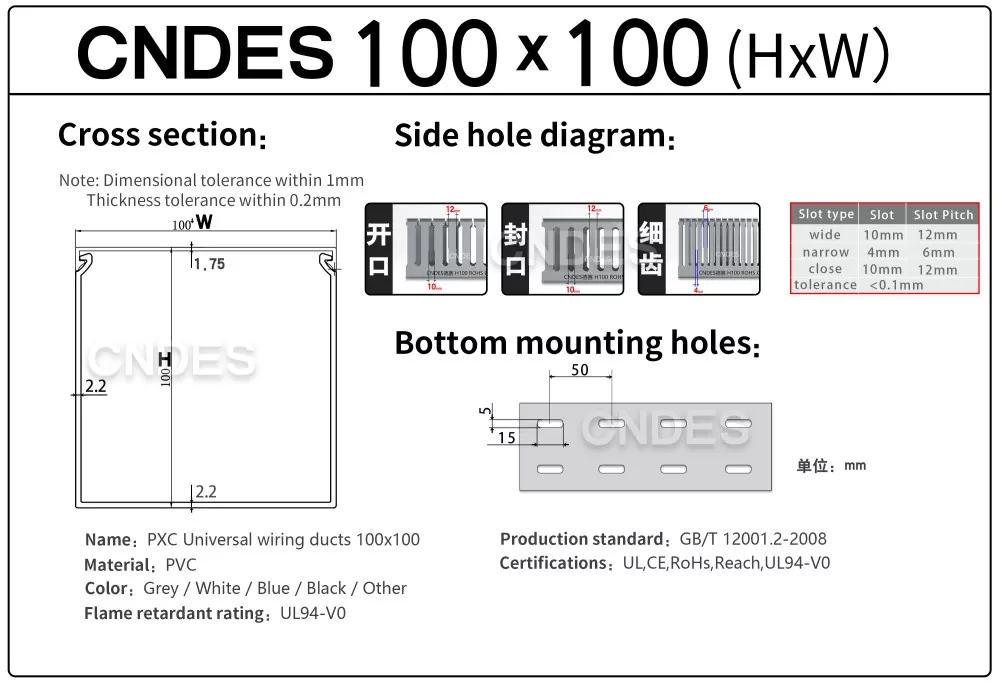 Optimice sus proyectos de cableado con nuestros conductos para cables de gestión de cables personalizados de 100 × 100. Como fabricante y proveedor líder de bandejas portacables de PVC en China, CNDES ofrece soluciones confiables, de alta precisión y personalizables para todas sus necesidades de gestión de cables. Contamos con todas las especificaciones de ductos de alambre (bandejas portacables). Si necesita otras especificaciones, ¡no dude en contactarnos!