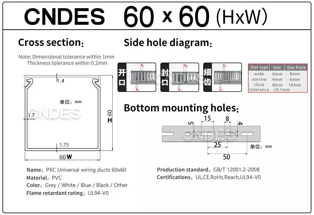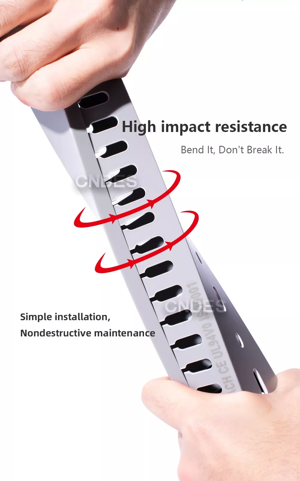 El conducto para cables del gabinete de control del CNDES está fabricado con una fórmula patentada de PVC. El conducto ranurado para gabinete de control de PVC es ecológico, retardante de llama y resistente a impactos, y puede soportar flexiones repetidas de 180° sin romperse.