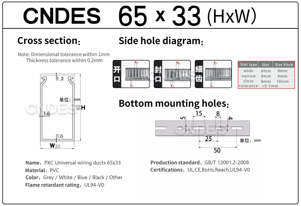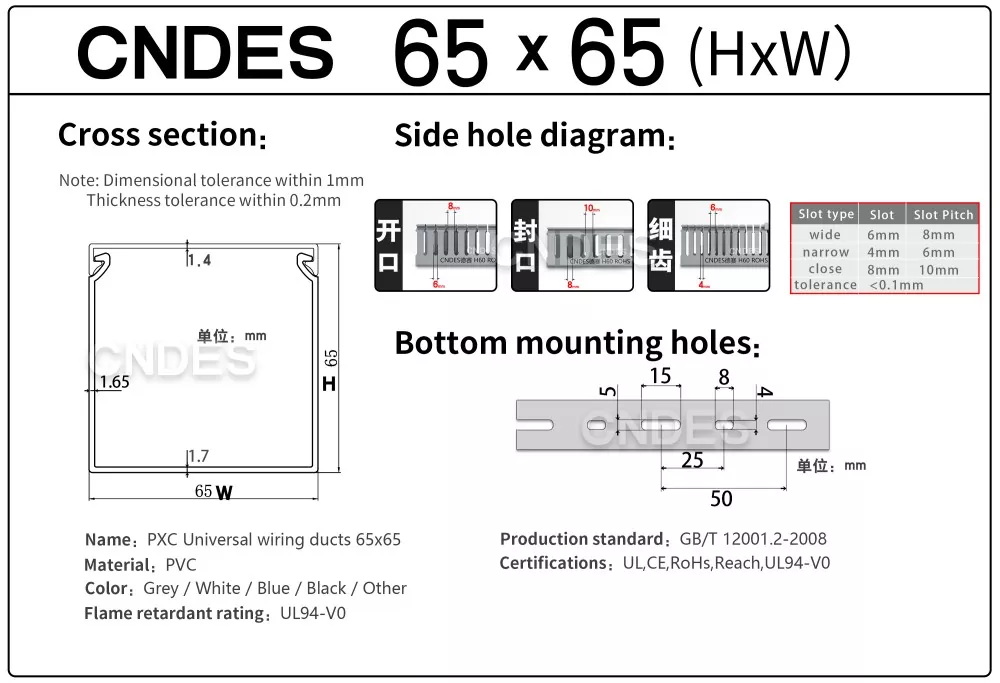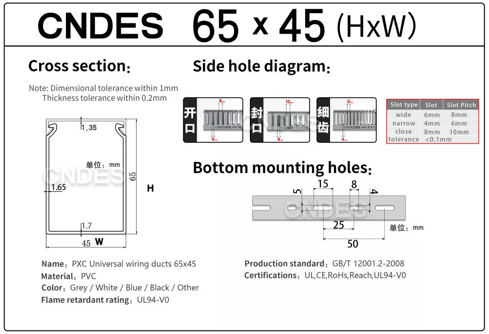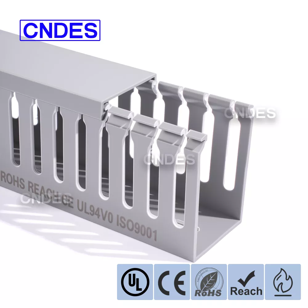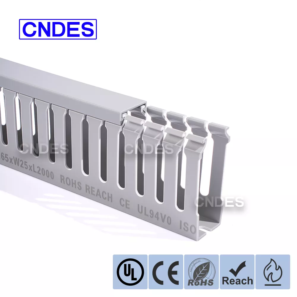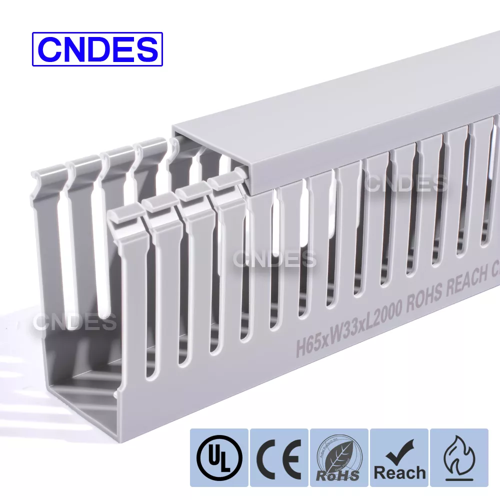 CNDES es una fábrica de fuentes de conductos de cableado de cables de PVC con 24 años de experiencia. El conducto de cableado industrial de PVC ranurado de 65 mm de altura personalizado es una solución ideal para organizar y proteger el cableado en entornos de alta densidad, como paneles de control industrial, equipos de automatización e instalaciones de maquinaria. Con una altura de 65 mm, ofrece un amplio espacio para acomodar haces de cables más grandes y, al mismo tiempo, garantiza una protección óptima contra factores ambientales como el polvo, la humedad y los daños mecánicos.