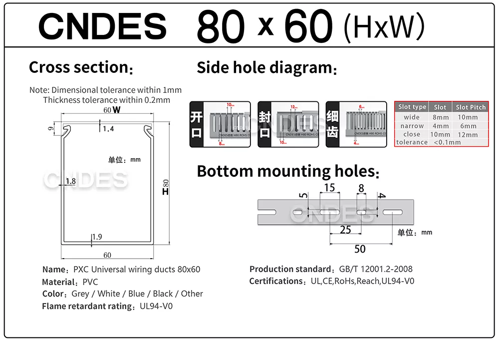 Aquí, le presentaremos nuestras especificaciones de 80*60 mm, 80*60. Representa una altura de 80 mm y un ancho de conducto de cableado de 60 mm.